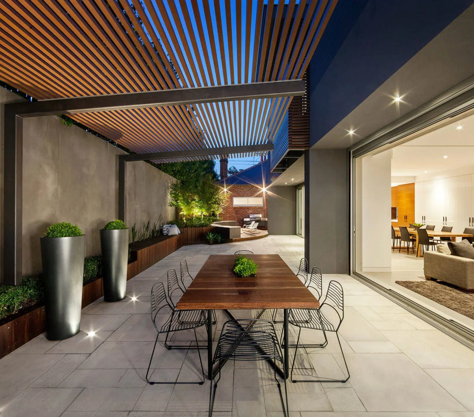 This stunning patio is defined by a sophisticated architectural pergola that seamlessly extends the home’s living space outdoors. A robust, dark metal frame supports a series of closely spaced wood slats, creating a visually striking linear pattern. This design not only provides significant shade but also casts dynamic light and shadow, enhancing the ambiance of the modern outdoor dining and lounge area below.