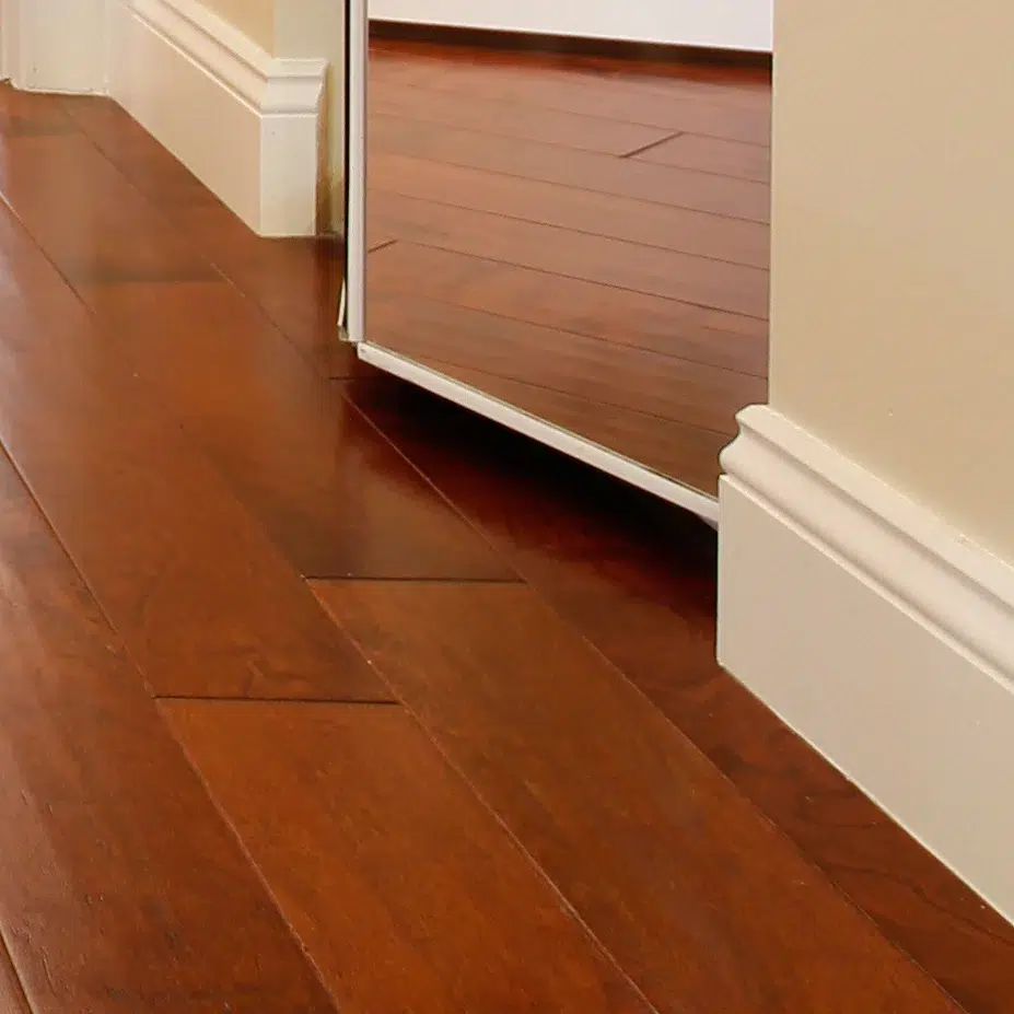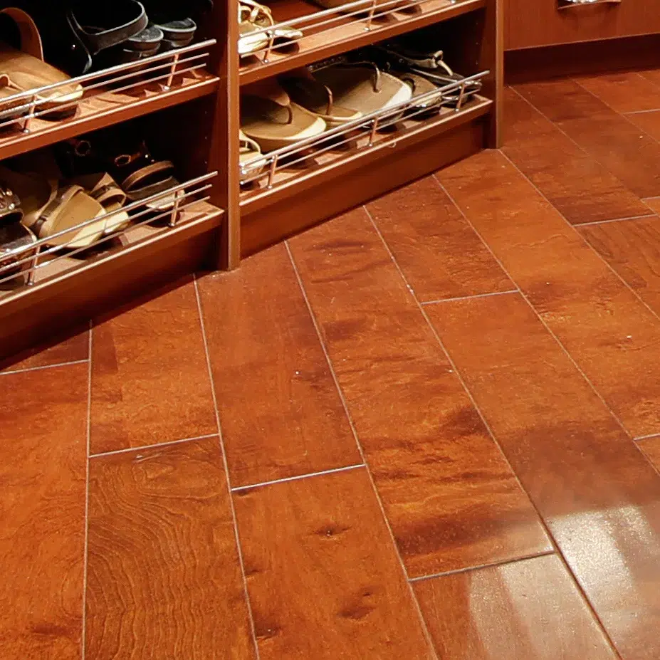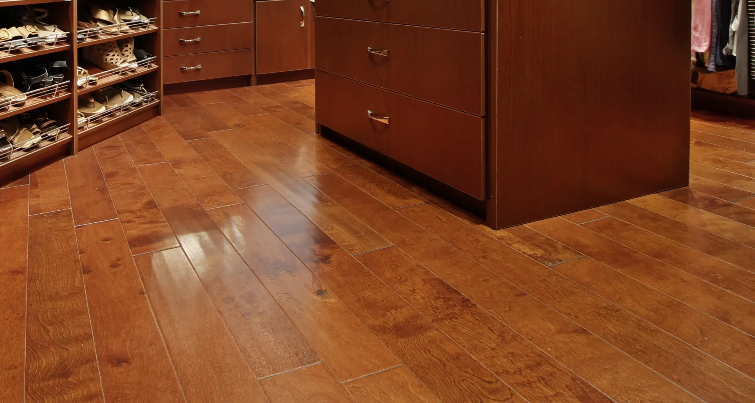This project showcases the timeless beauty and rich character of handscraped cherry wood flooring. The distinctive, textured surface adds depth and a unique artisanal feel to the rich, cherry-toned planks, whose glossy finish beautifully reflects light. Installed seamlessly throughout a hallway and into a luxurious walk-in closet, and framed by crisp white baseboards, this flooring establishes an elegant foundation that is both sophisticated and full of character.
