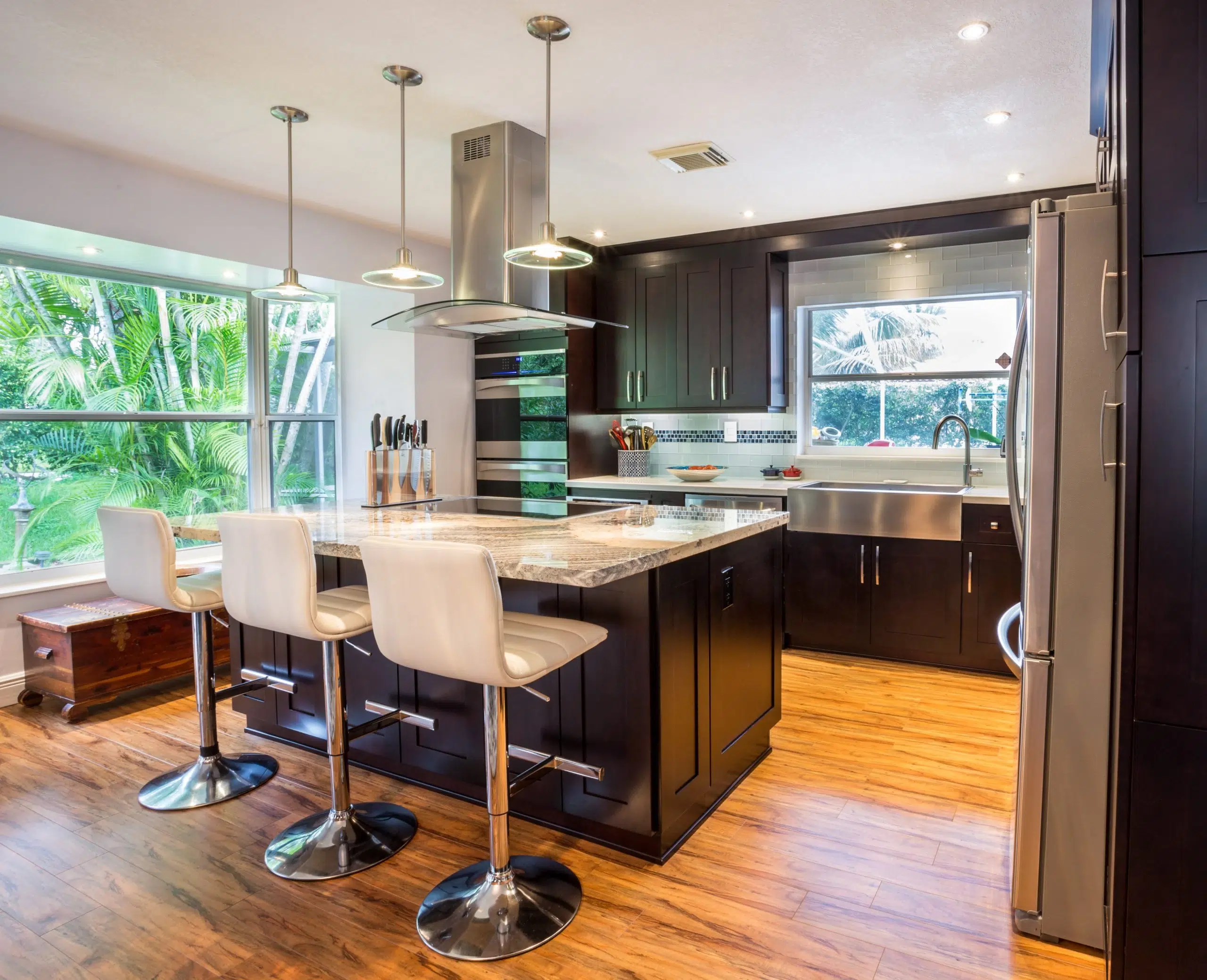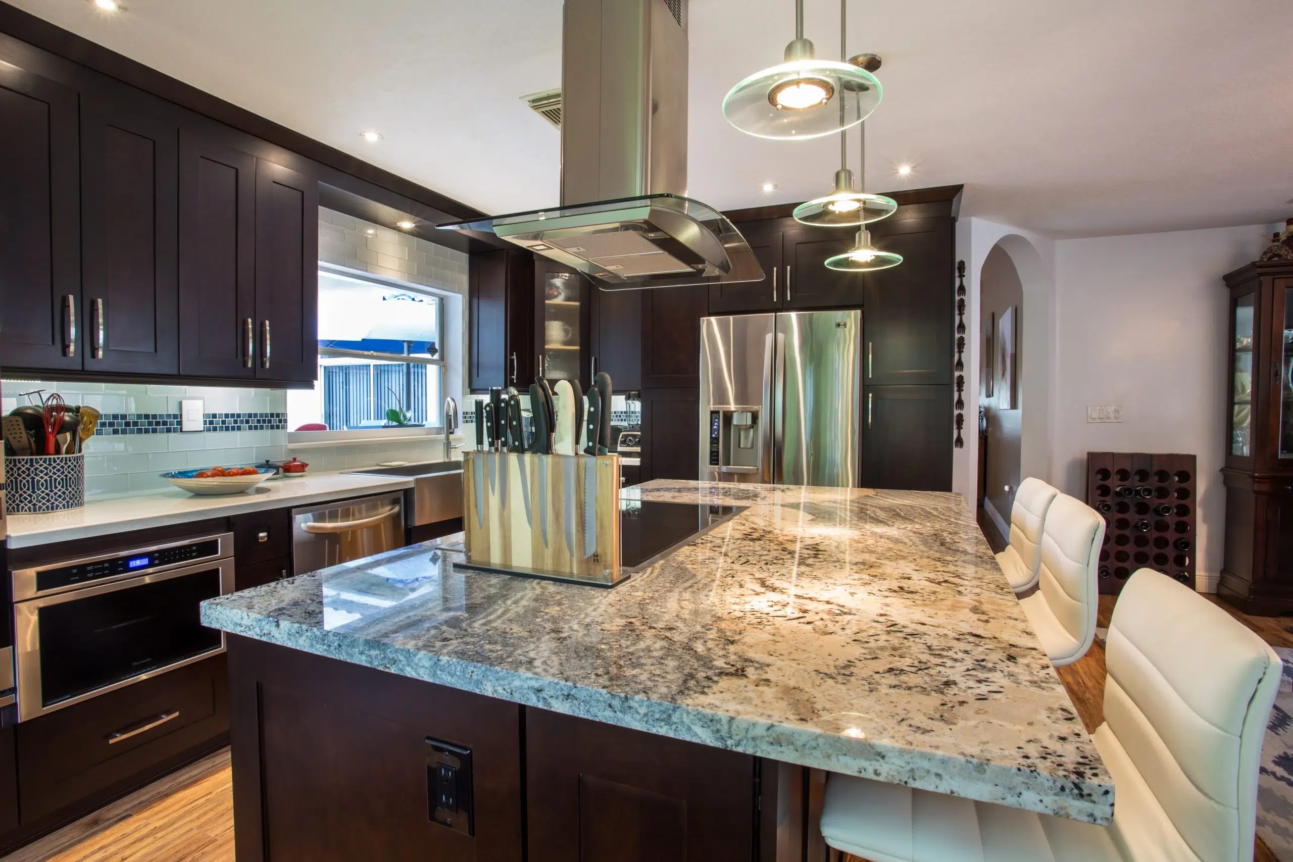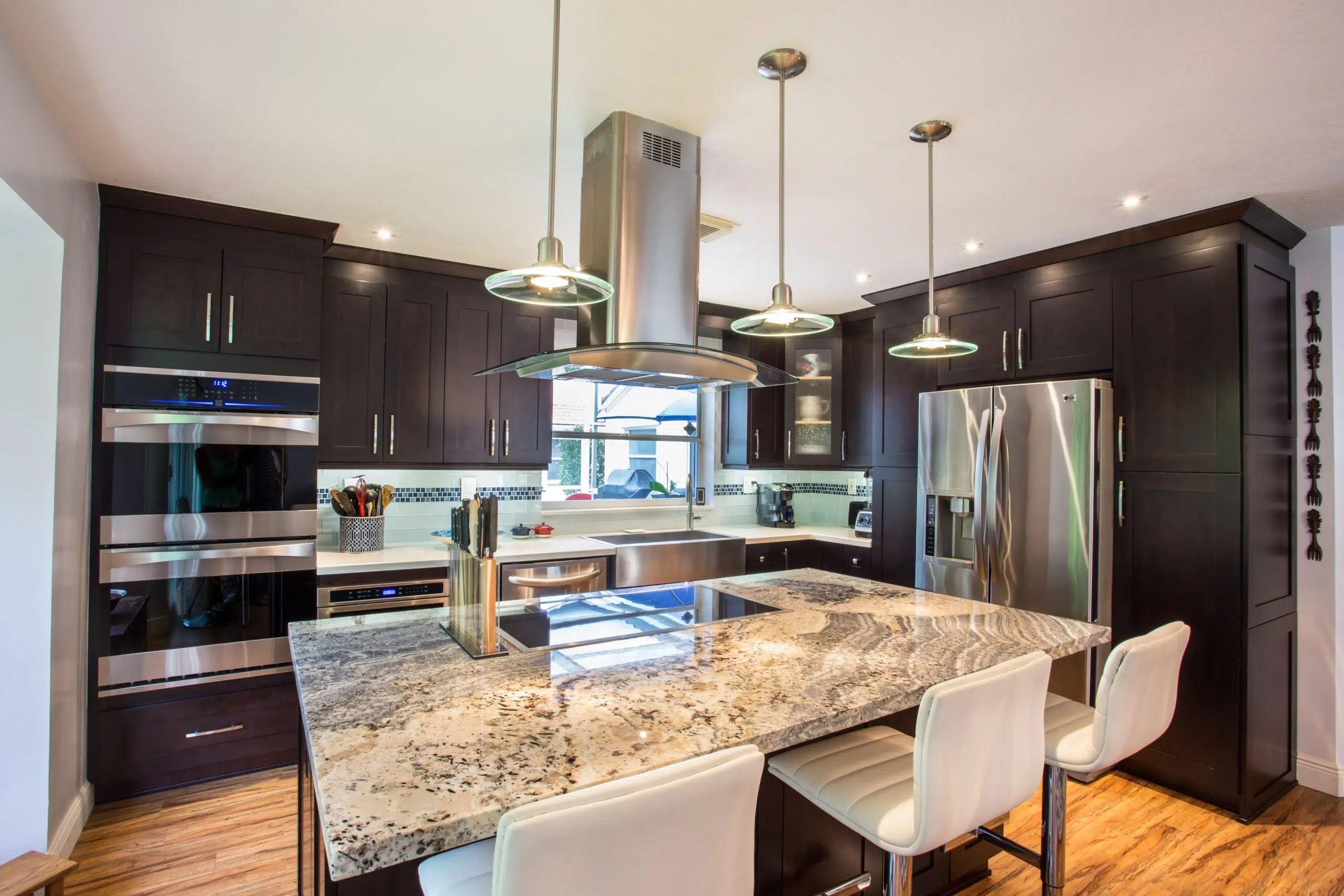 This kitchen exudes modern elegance through its dark wood cabinetry, premium stainless steel appliances, and a striking granite island that serves as both a culinary workspace and a stylish gathering area. The open layout and large windows invite natural light, enhancing the clean lines and luxurious finishes throughout the space.