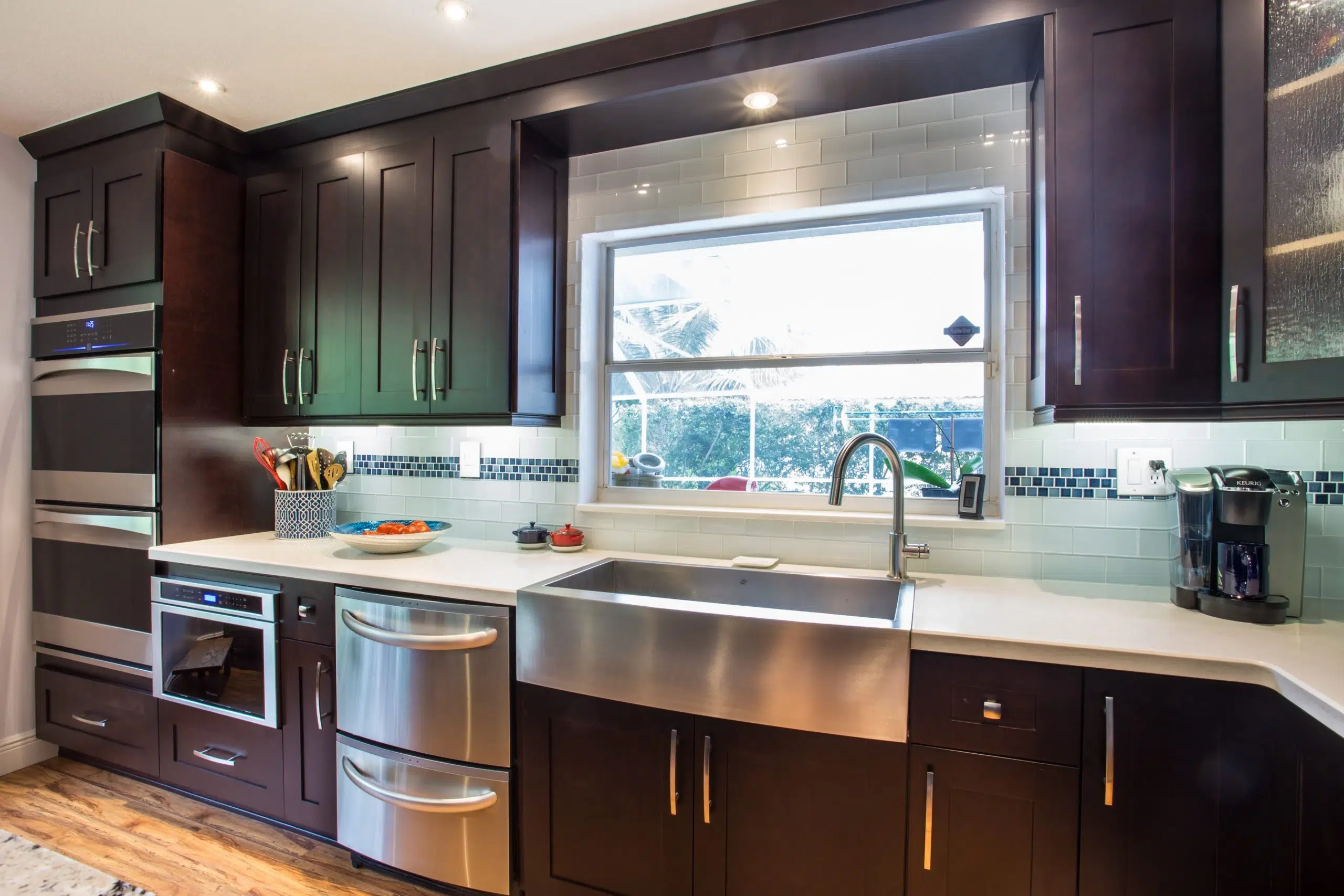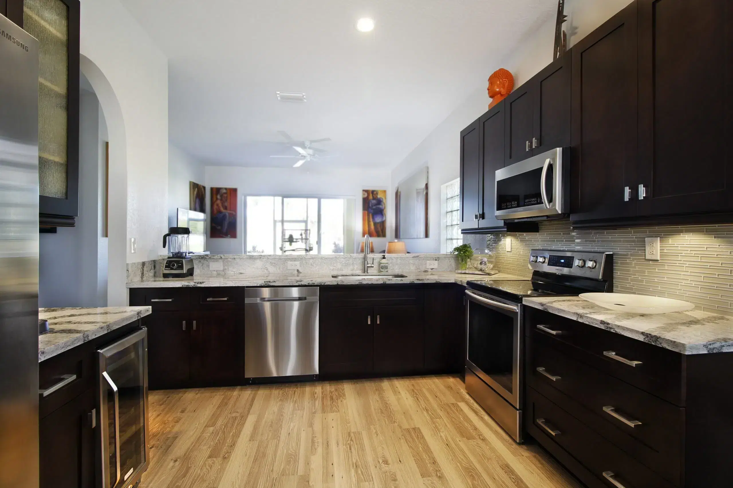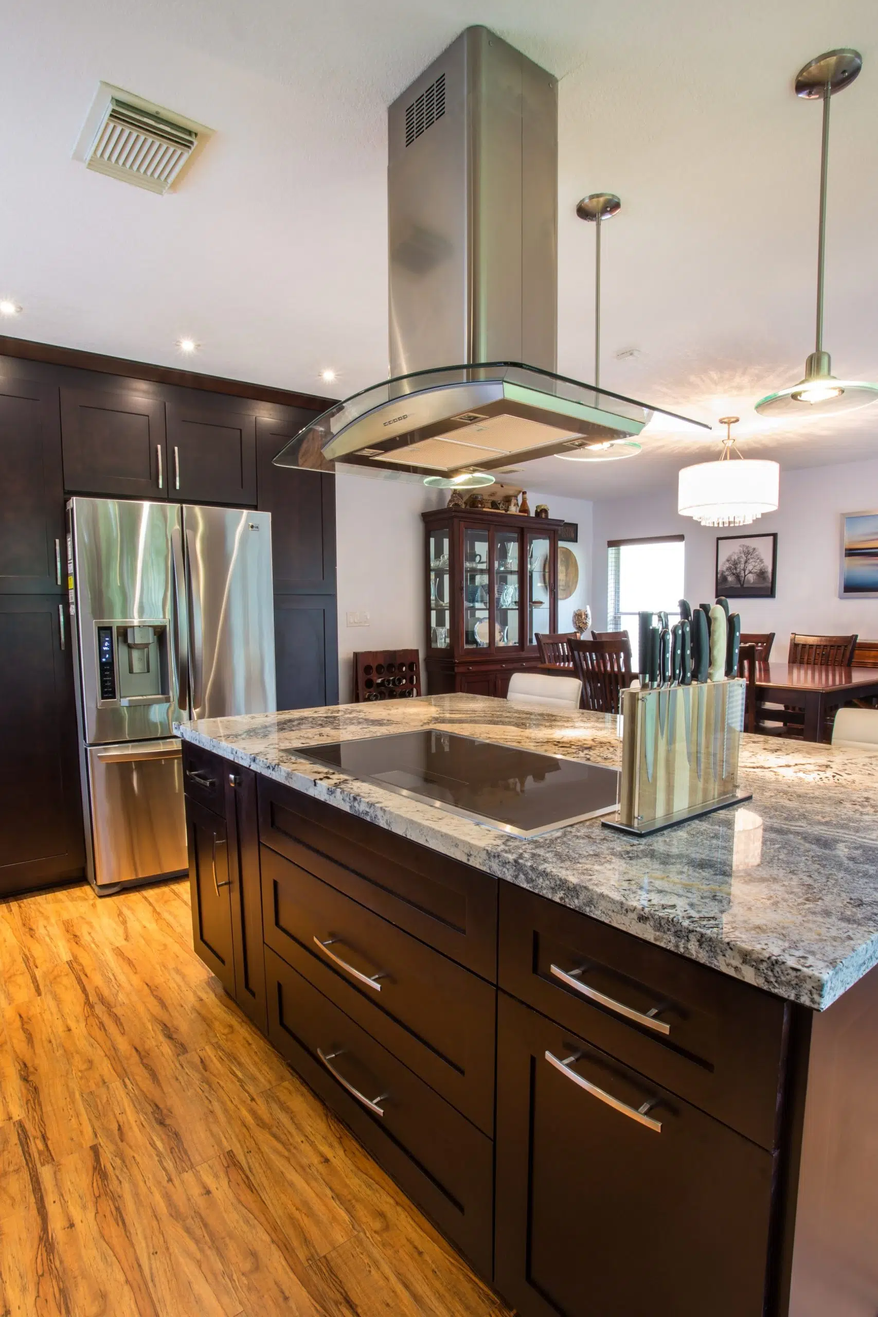 This kitchen exudes modern elegance through its dark wood cabinetry, premium stainless steel appliances, and a striking granite island that serves as both a culinary workspace and a stylish gathering area. The open layout and large windows invite natural light, enhancing the clean lines and luxurious finishes throughout the space.