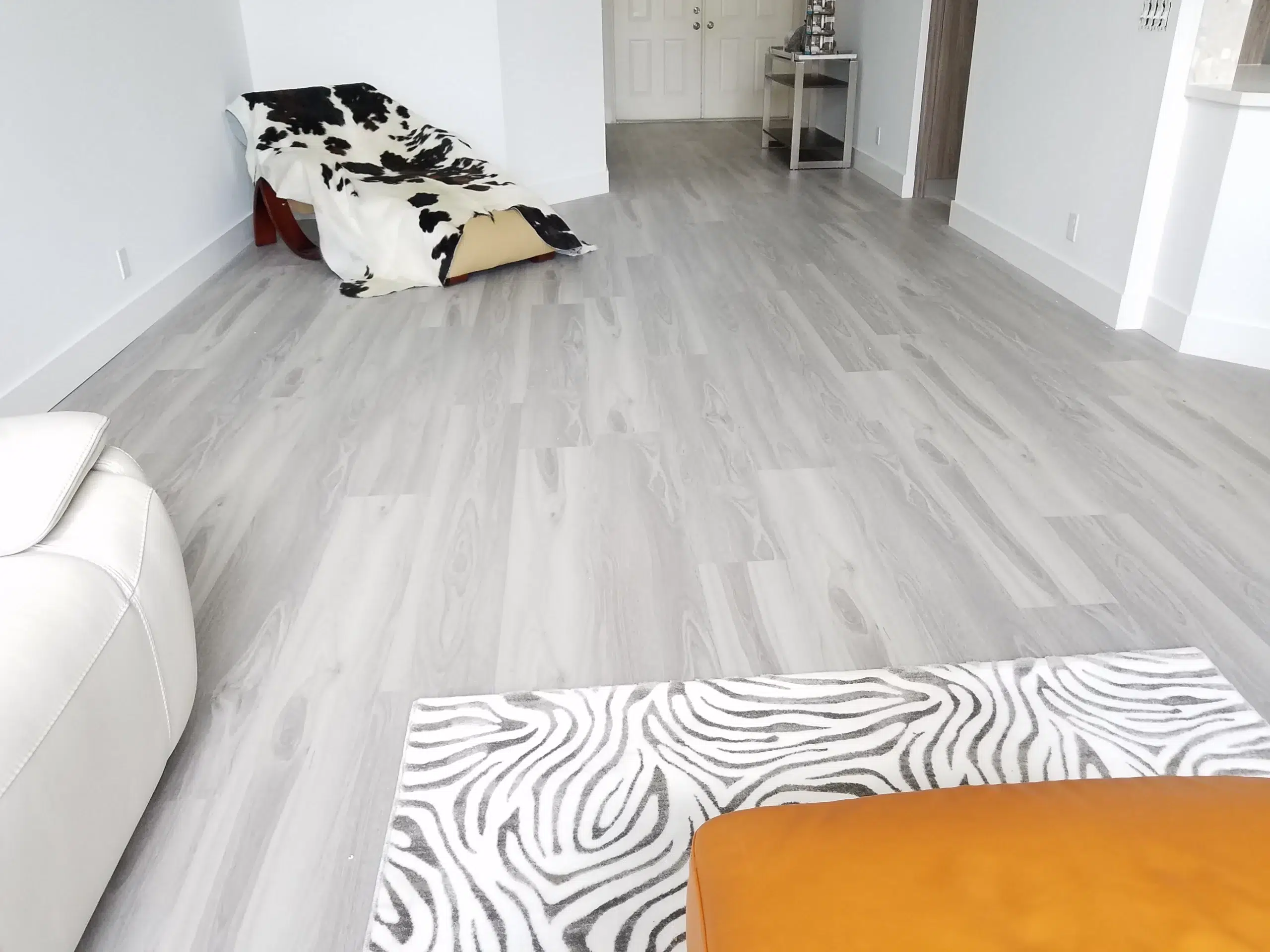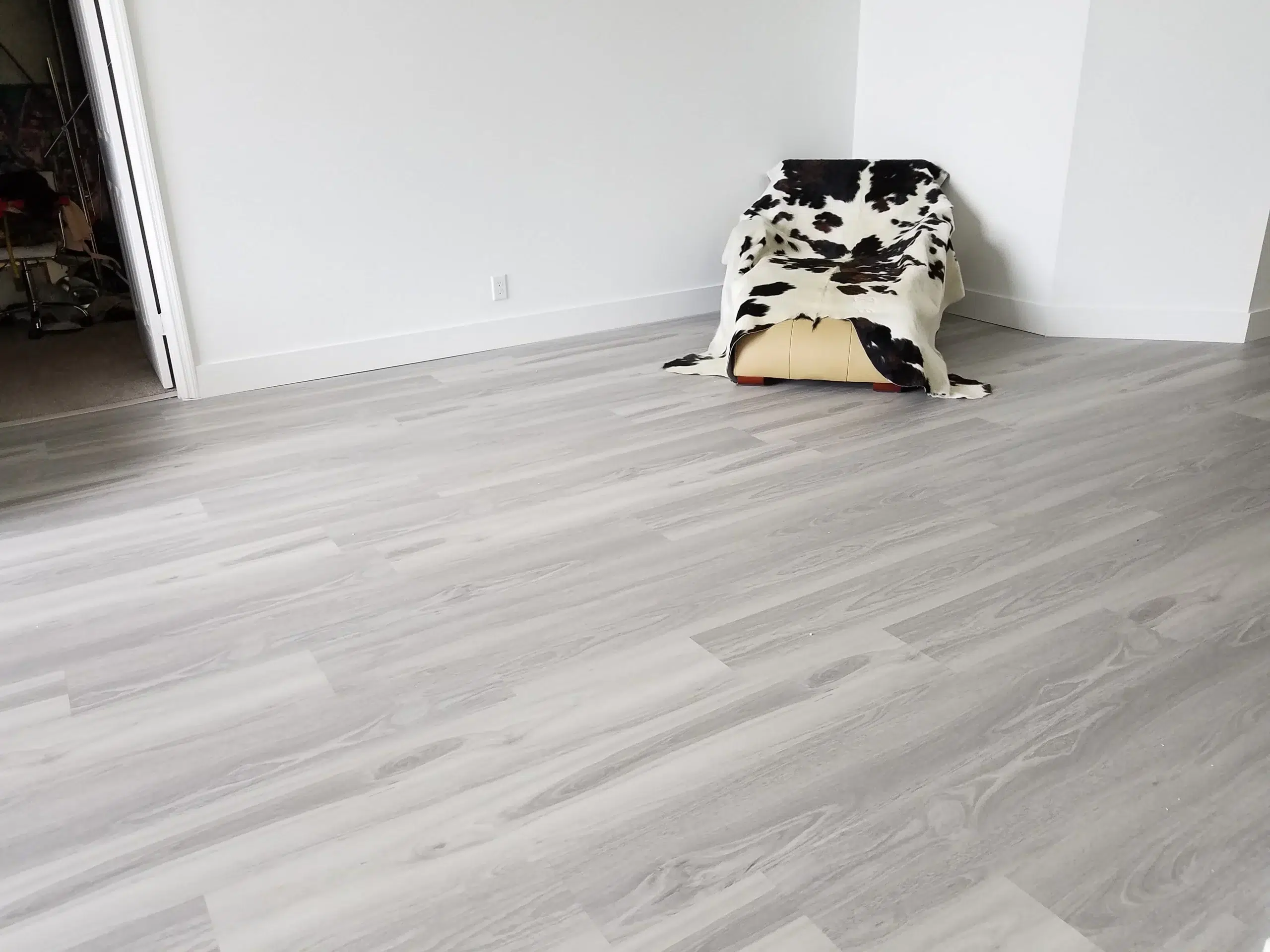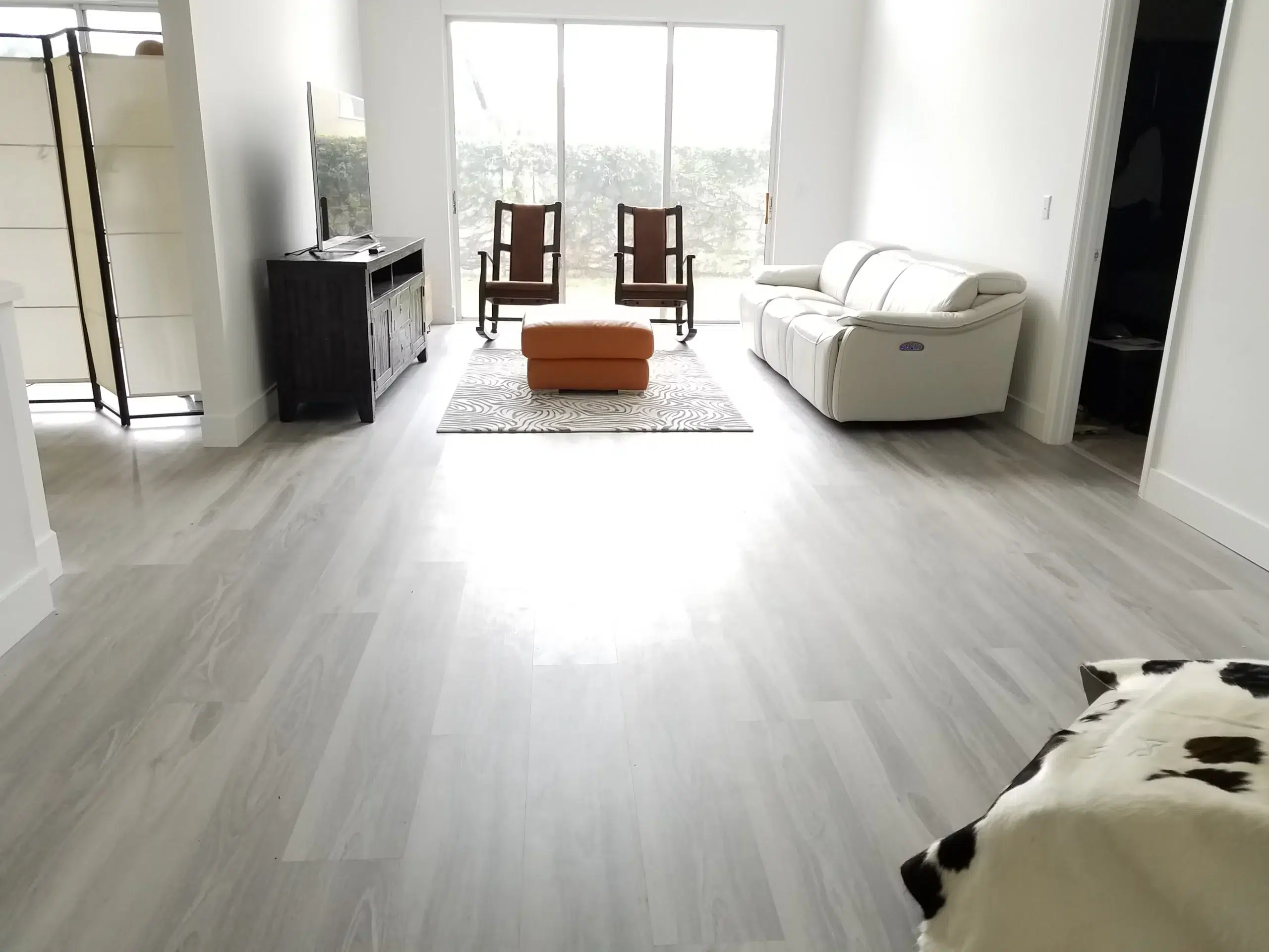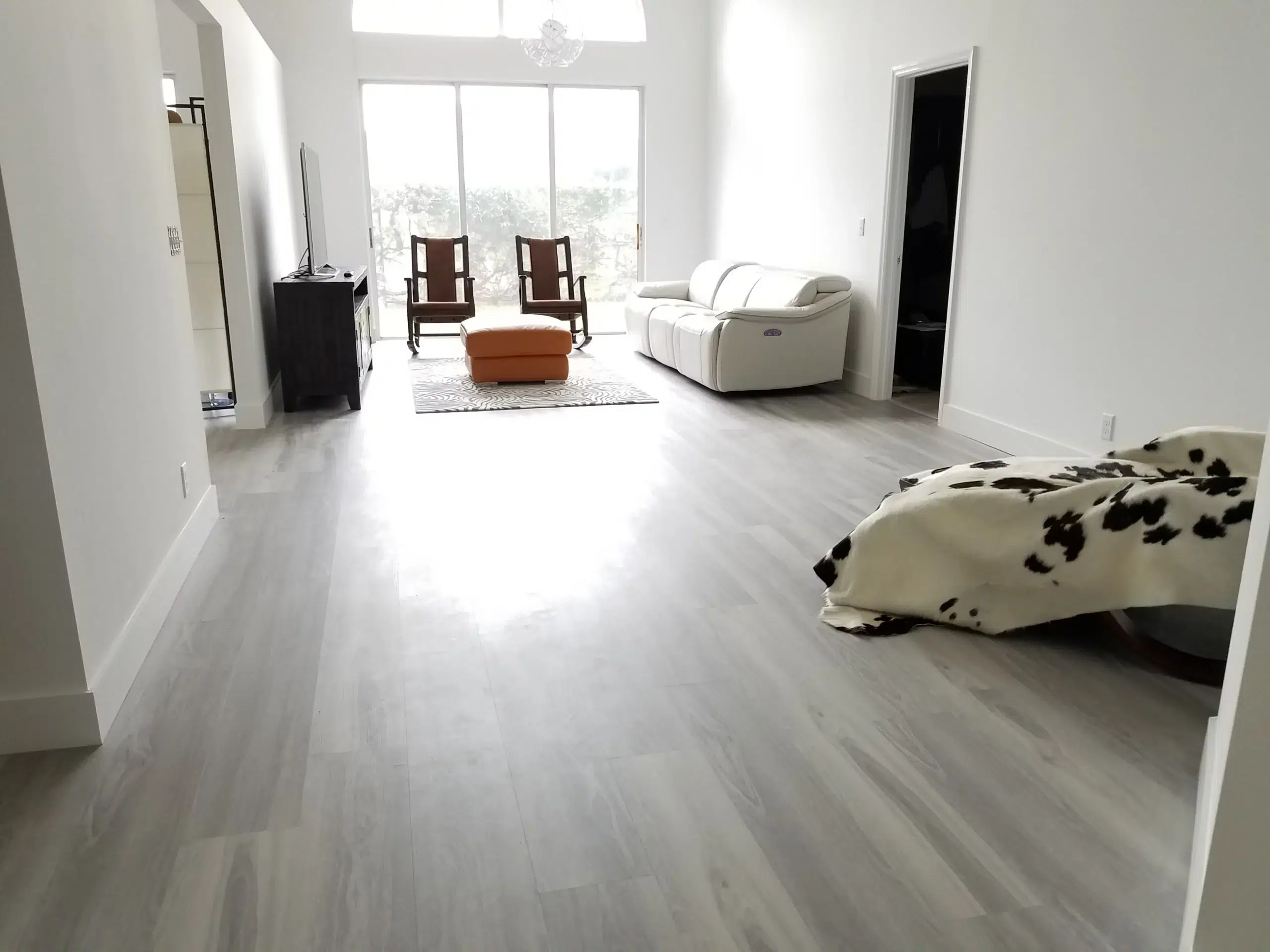 This project highlights a stunning transformation with the installation of chic, light gray wood-look laminate flooring. The wide planks flow seamlessly through the open-concept space, creating a bright, cohesive, and contemporary foundation. Paired with fresh white walls and tall baseboards, this new flooring instantly elevates the home, making it feel more spacious and modern.