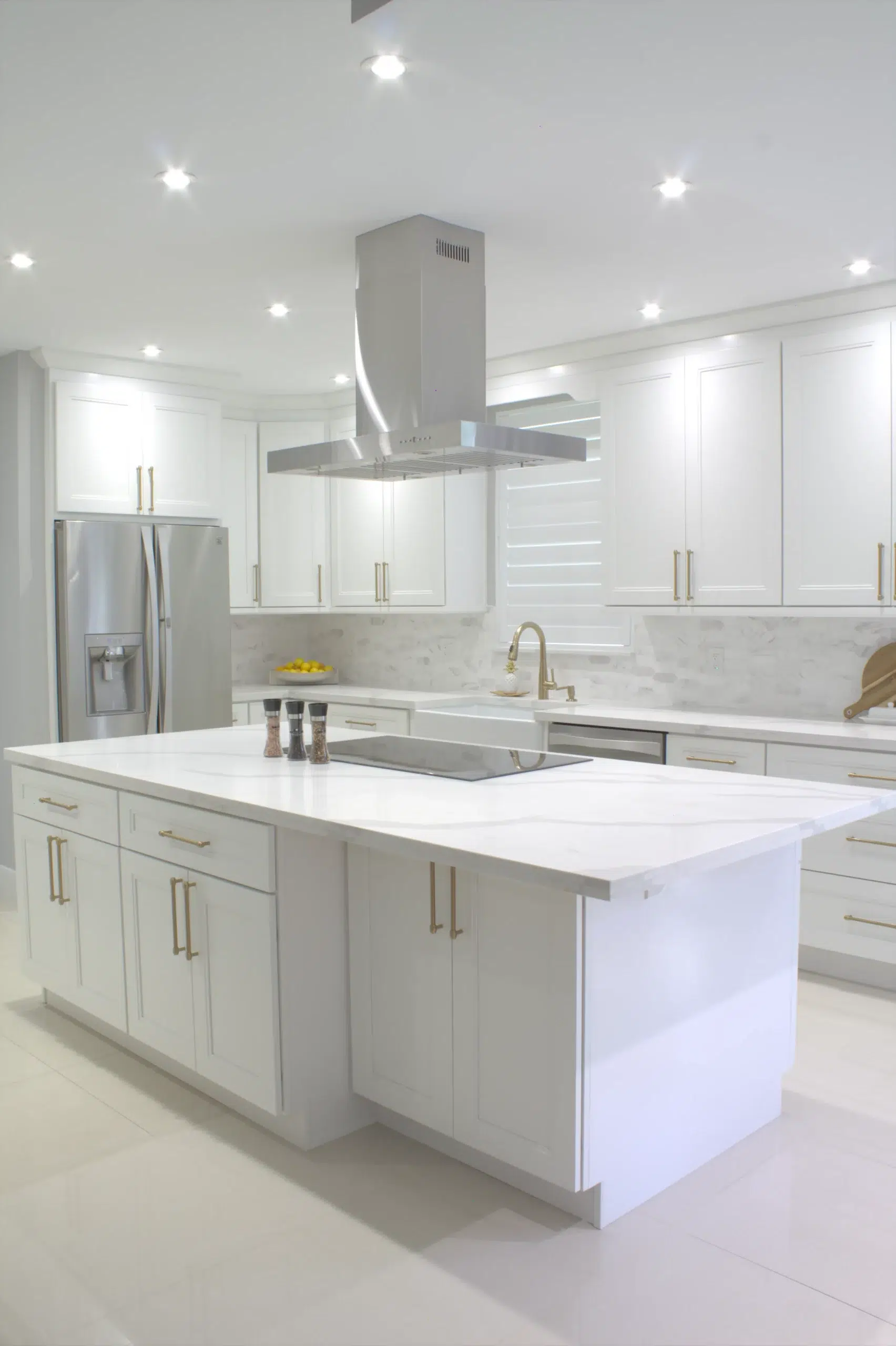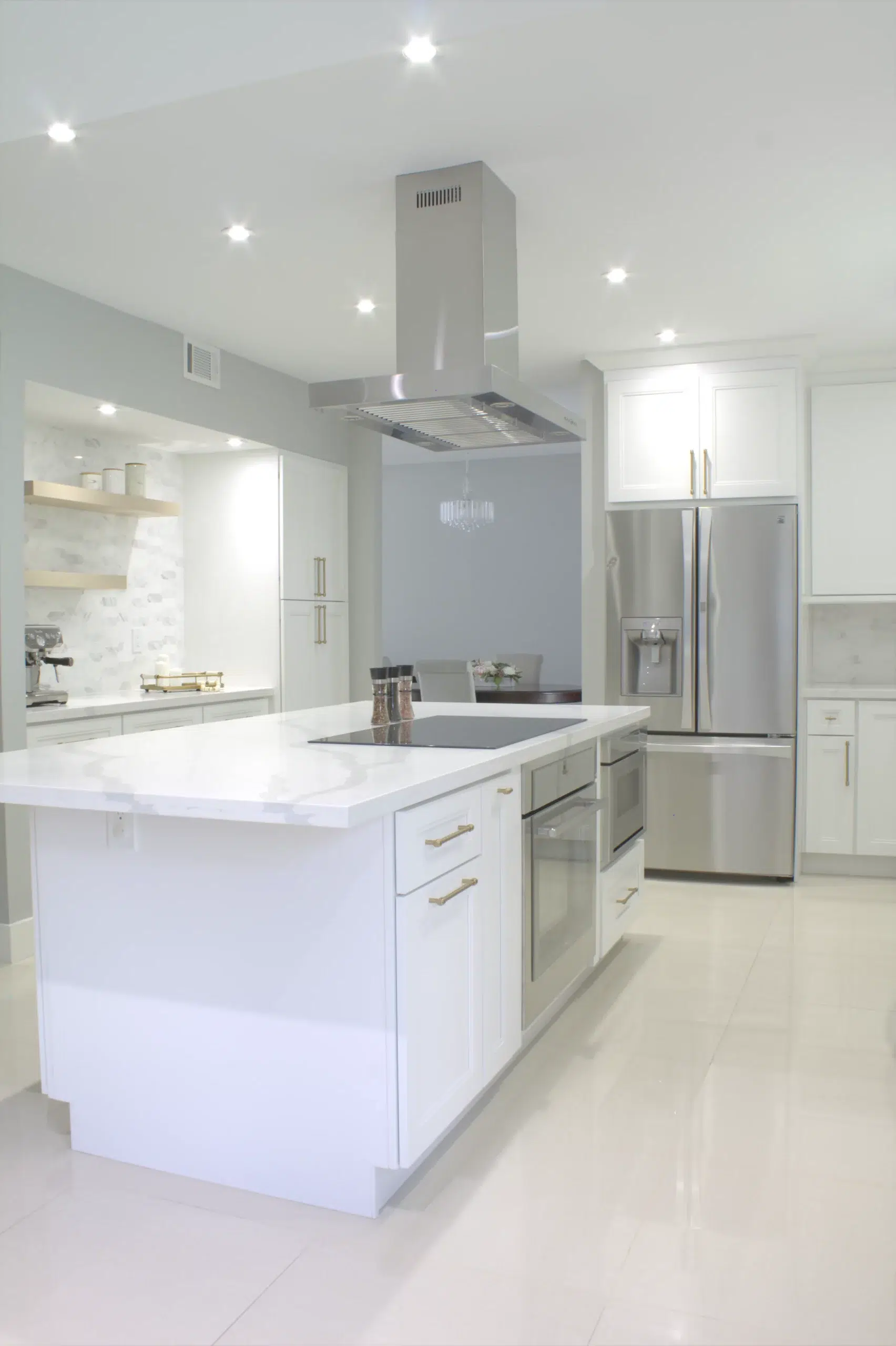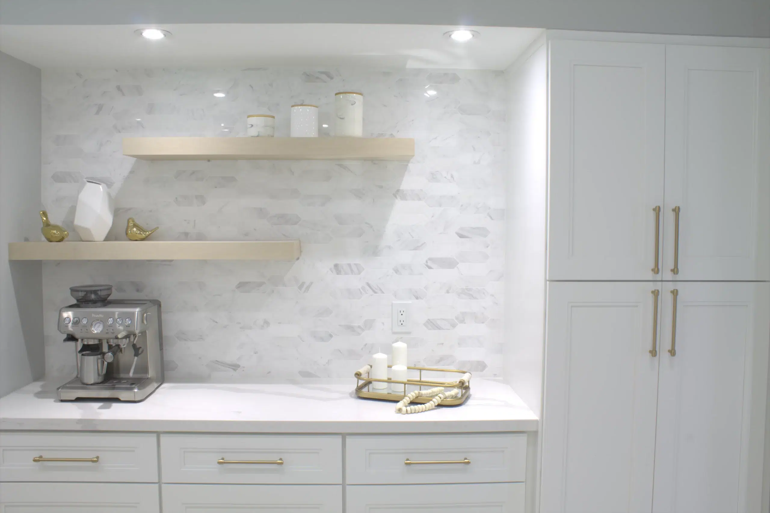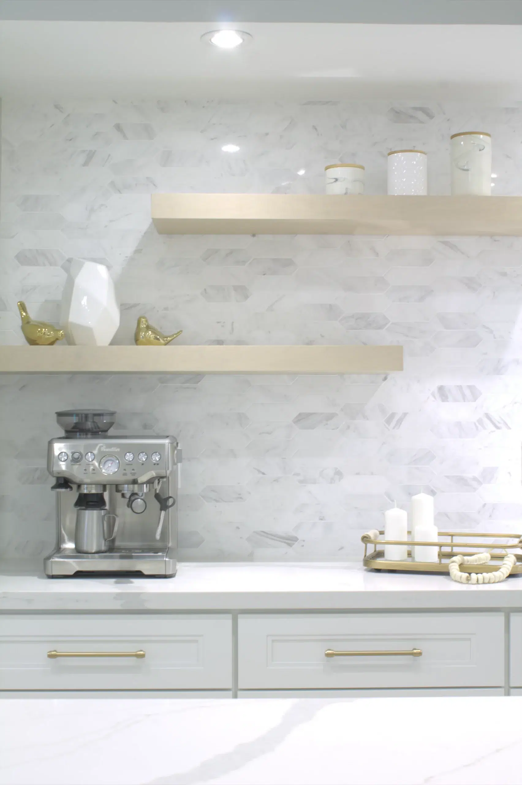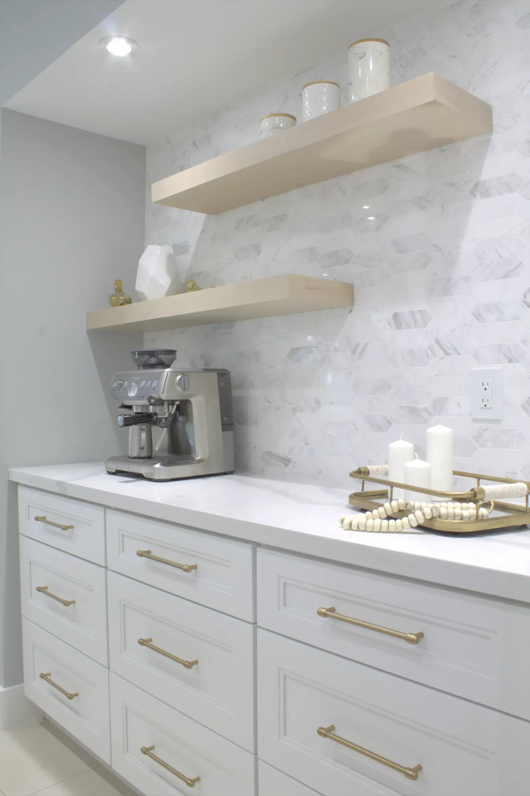 Experience pure sophistication in this stunningly bright kitchen, where classic luxury meets contemporary design. Crisp white cabinetry is elegantly accented with brushed gold hardware, perfectly complementing the geometric marble backsplash. A large central island with a built-in cooktop anchors the space, while a dedicated coffee bar with floating wood shelves adds a warm, bespoke touch. This kitchen is a luminous showcase of high-end finishes and meticulous design.