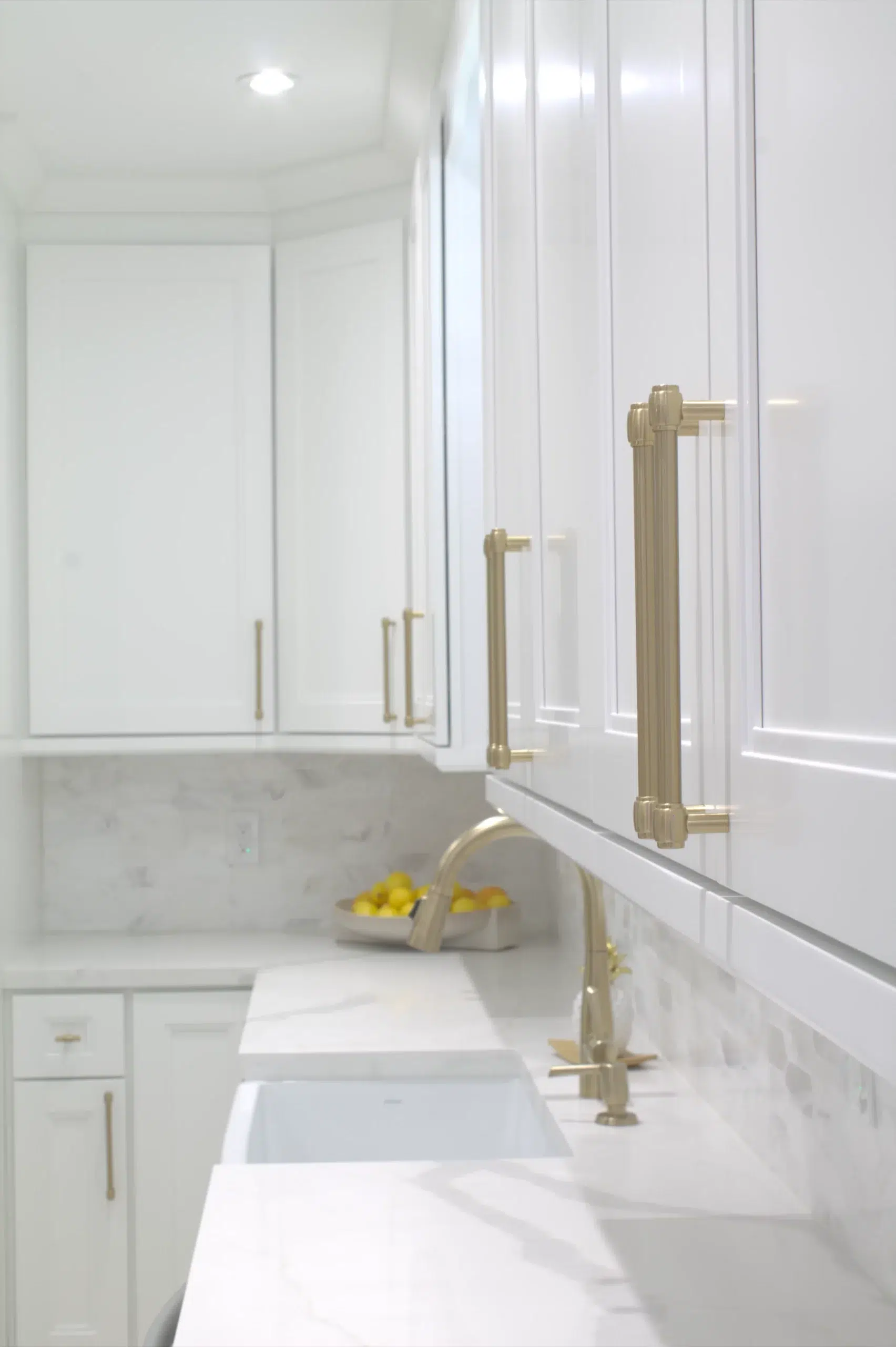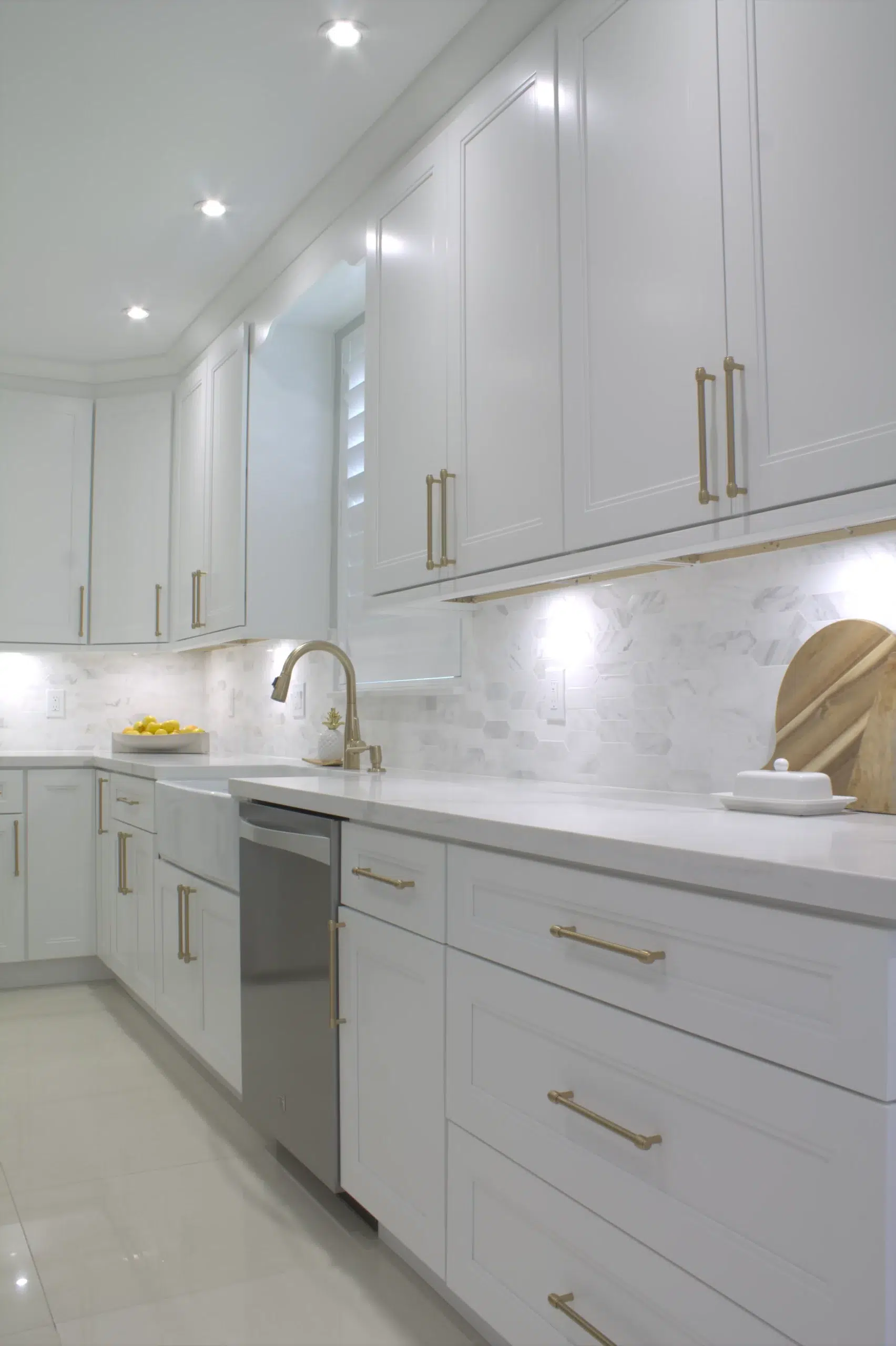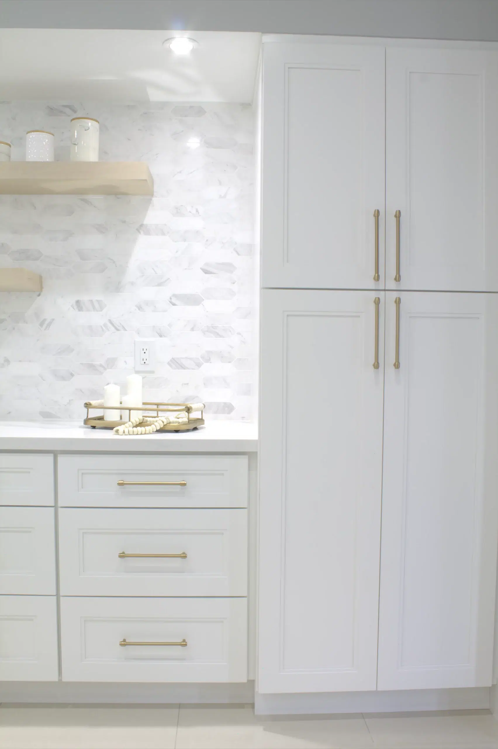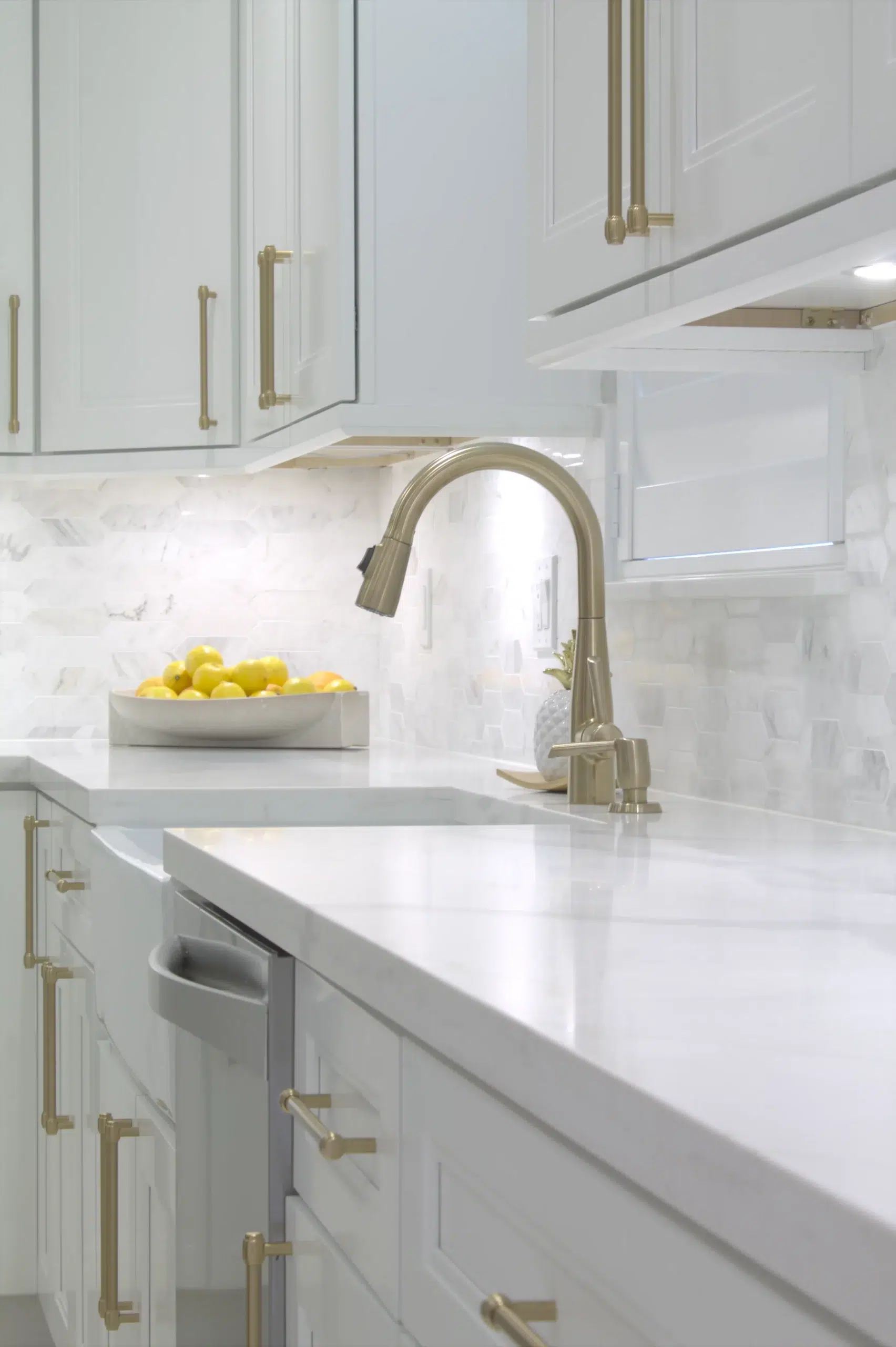 Experience pure sophistication in this stunningly bright kitchen, where classic luxury meets contemporary design. Crisp white cabinetry is elegantly accented with brushed gold hardware, perfectly complementing the geometric marble backsplash. A large central island with a built-in cooktop anchors the space, while a dedicated coffee bar with floating wood shelves adds a warm, bespoke touch. This kitchen is a luminous showcase of high-end finishes and meticulous design.