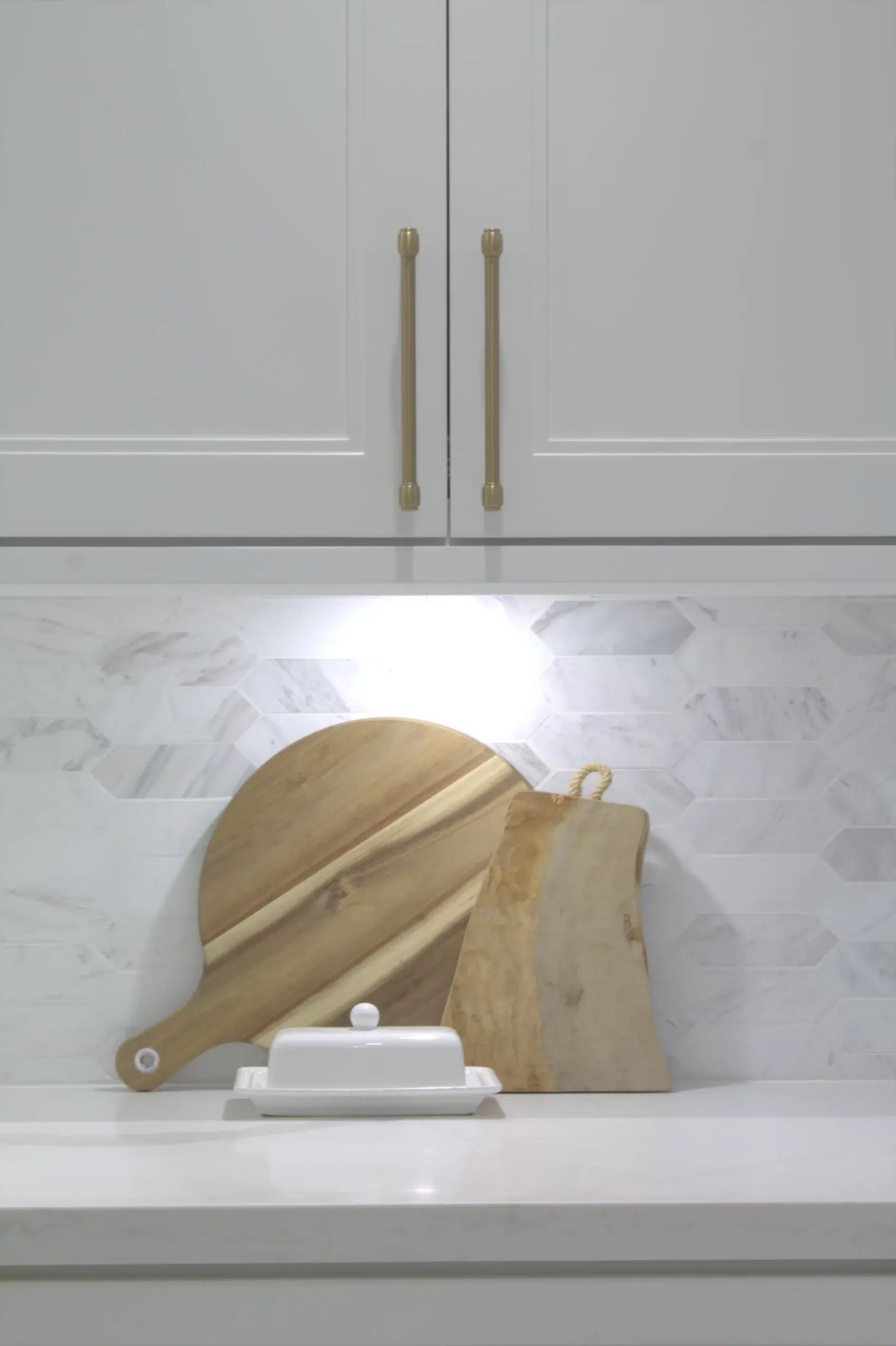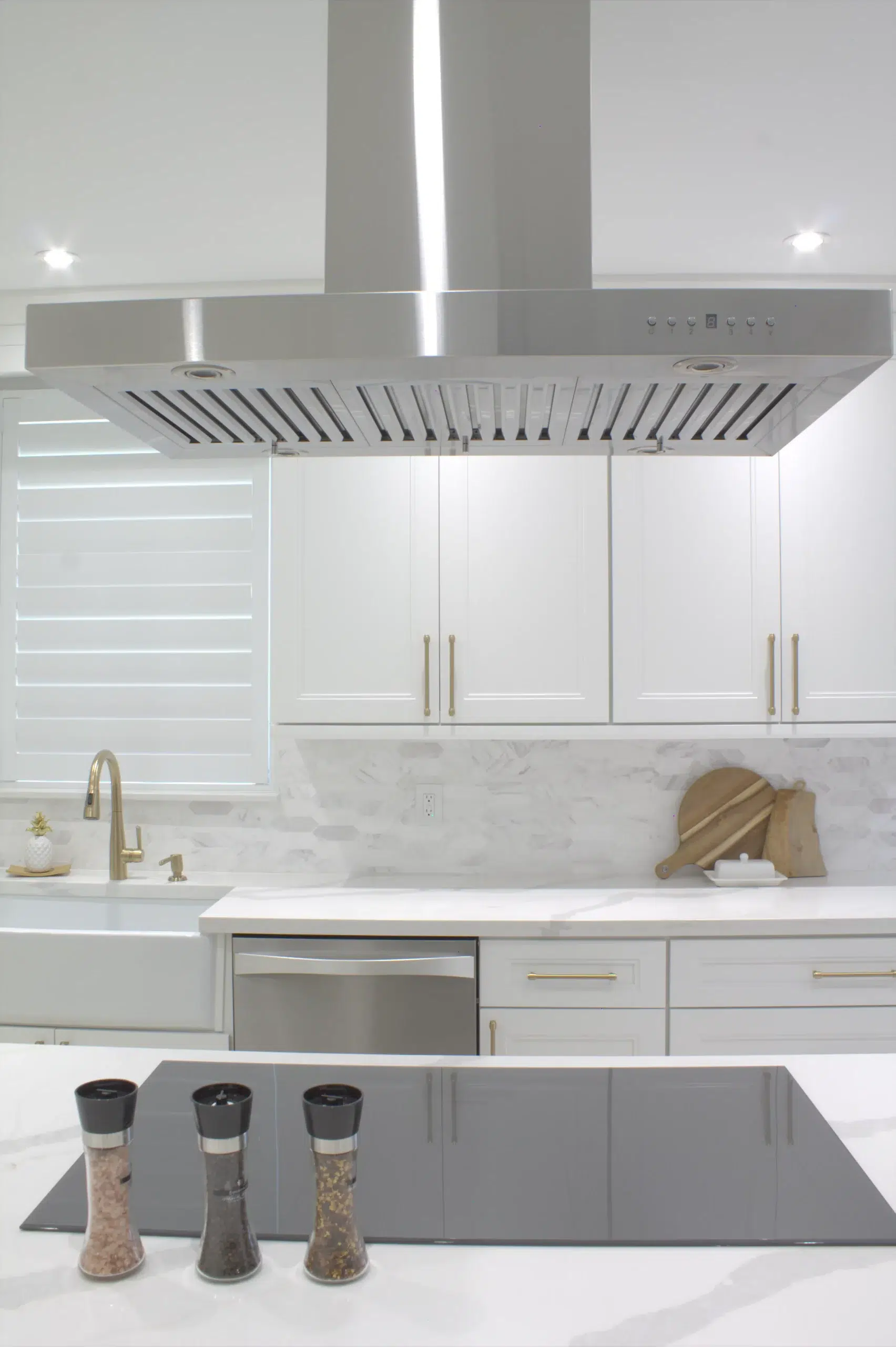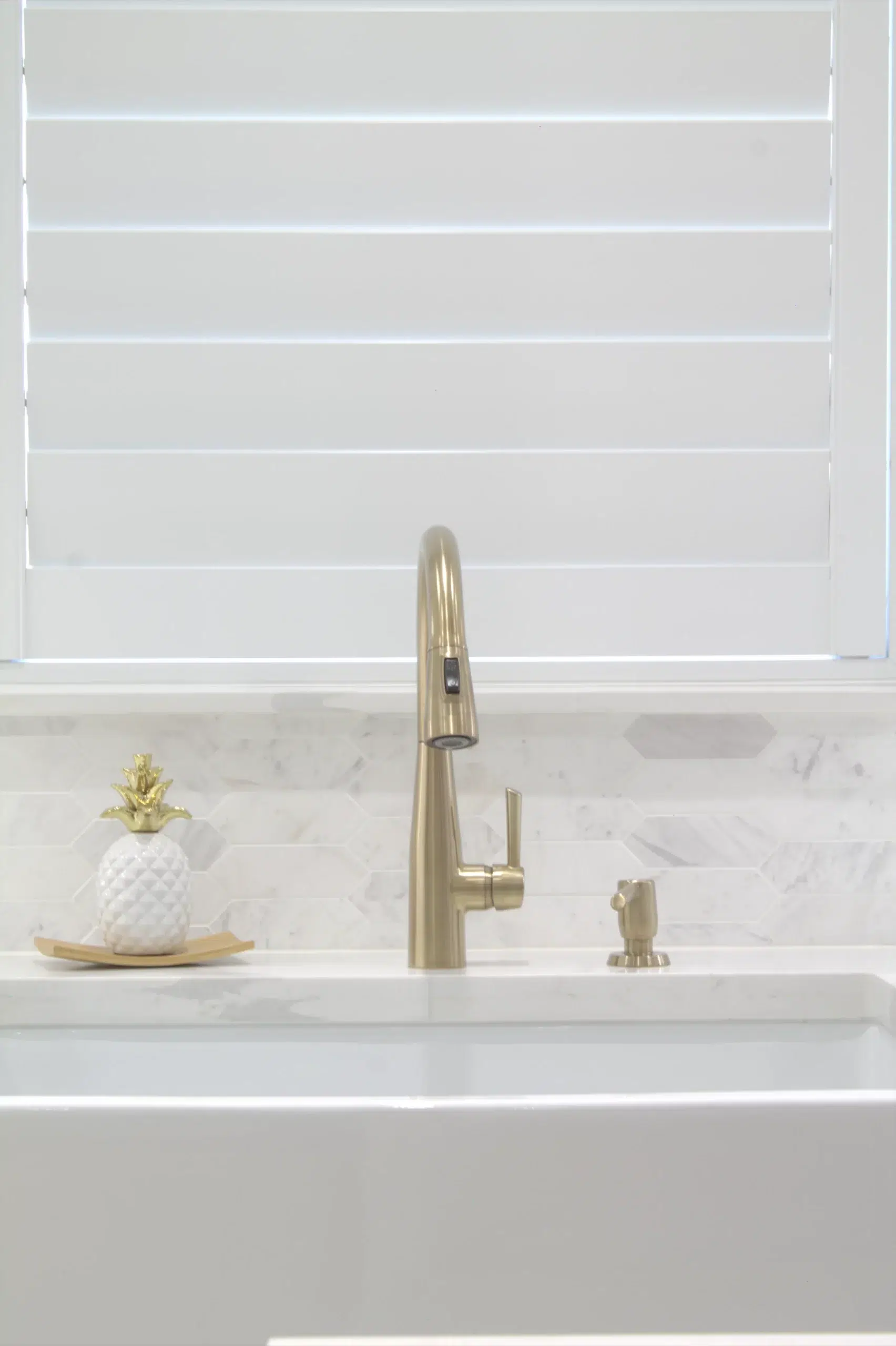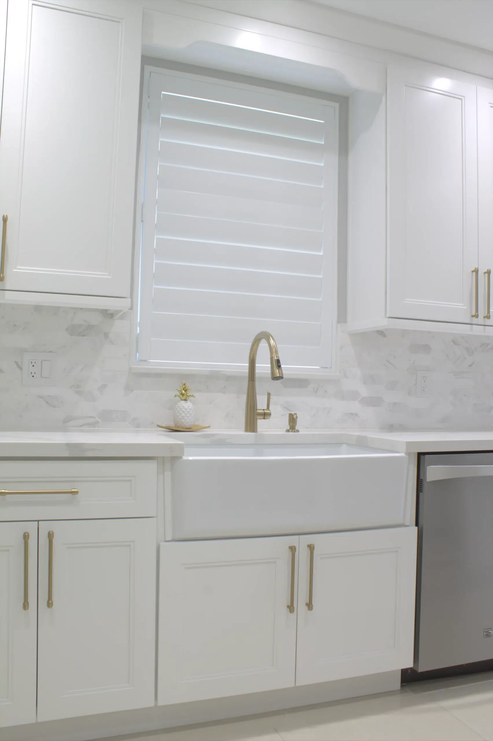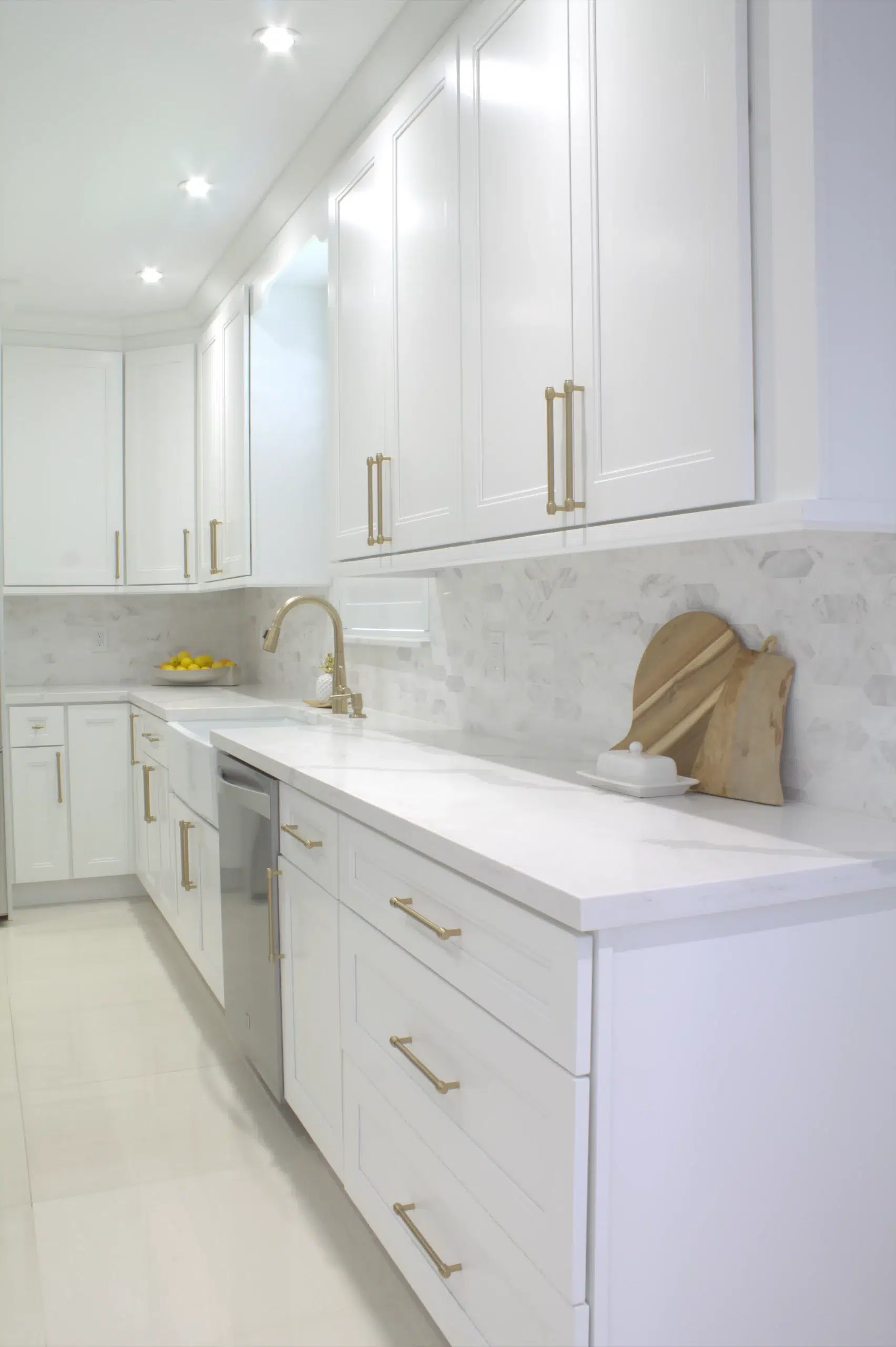 Experience pure sophistication in this stunningly bright kitchen, where classic luxury meets contemporary design. Crisp white cabinetry is elegantly accented with brushed gold hardware, perfectly complementing the geometric marble backsplash. A large central island with a built-in cooktop anchors the space, while a dedicated coffee bar with floating wood shelves adds a warm, bespoke touch. This kitchen is a luminous showcase of high-end finishes and meticulous design.