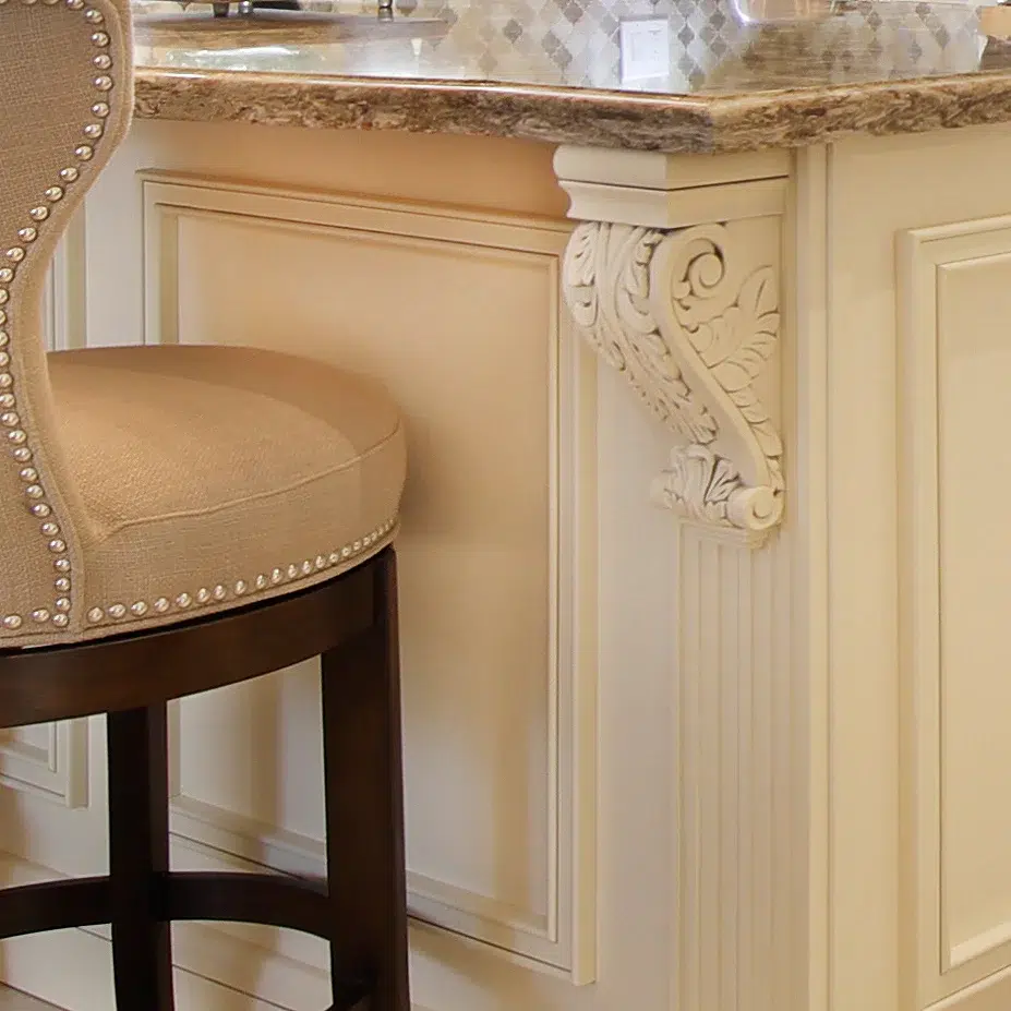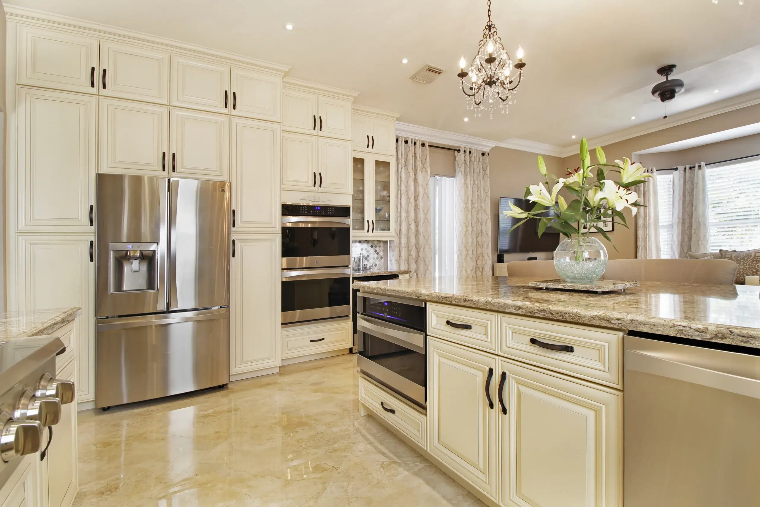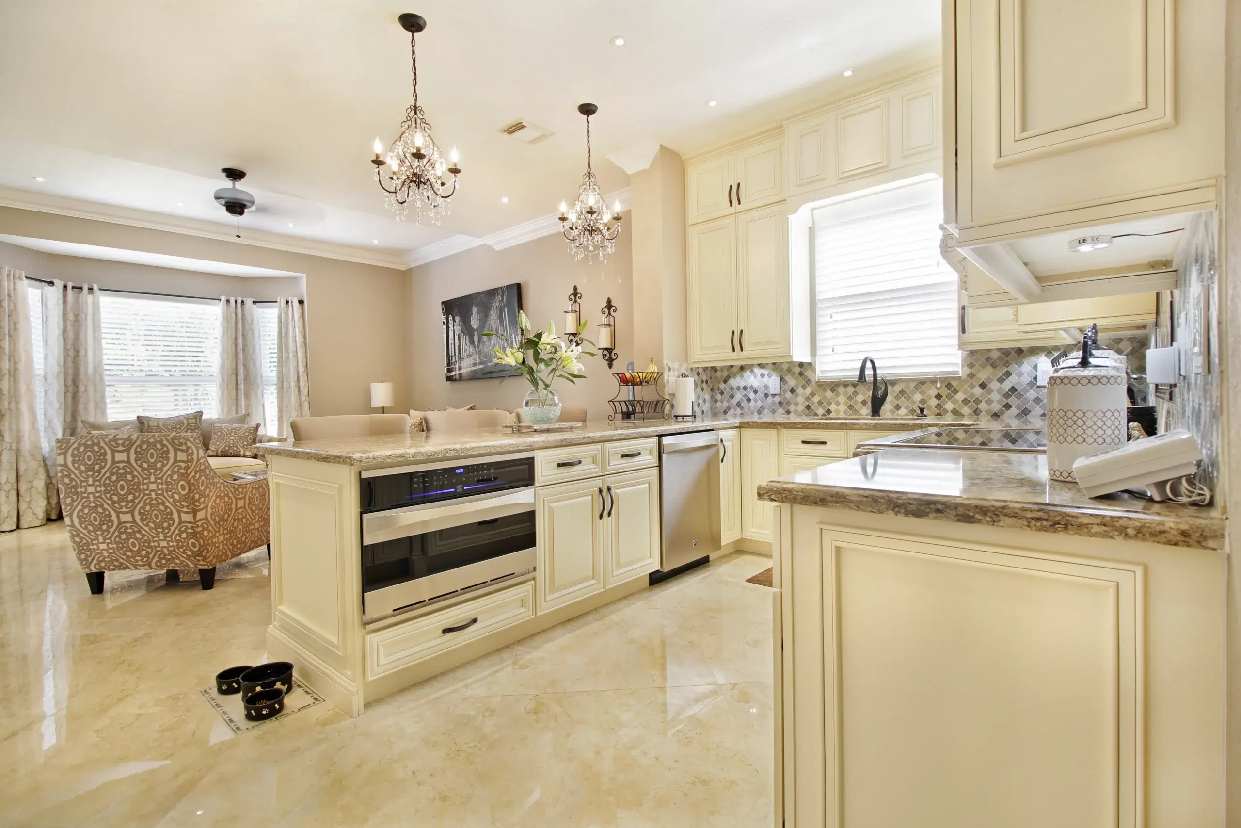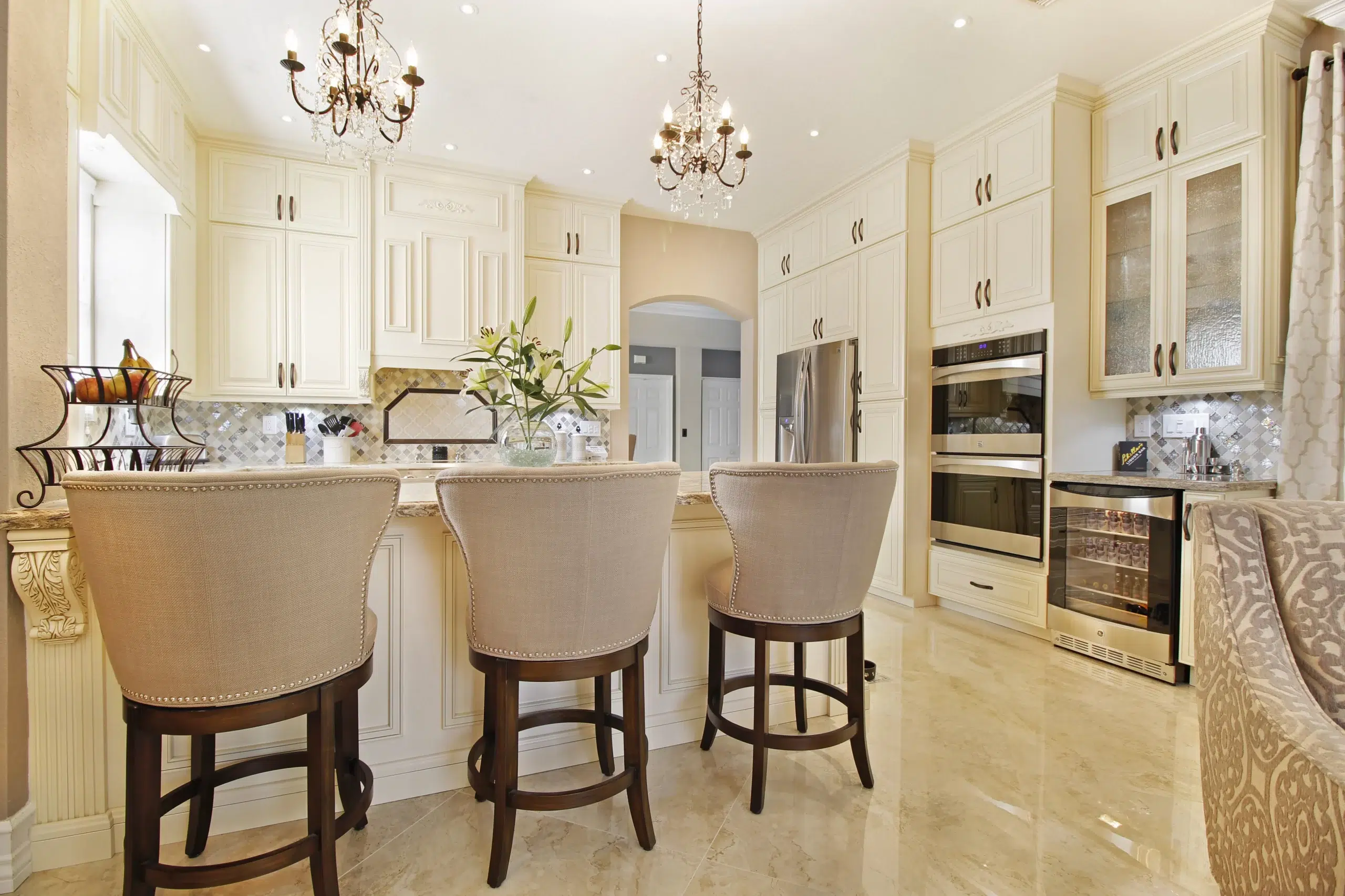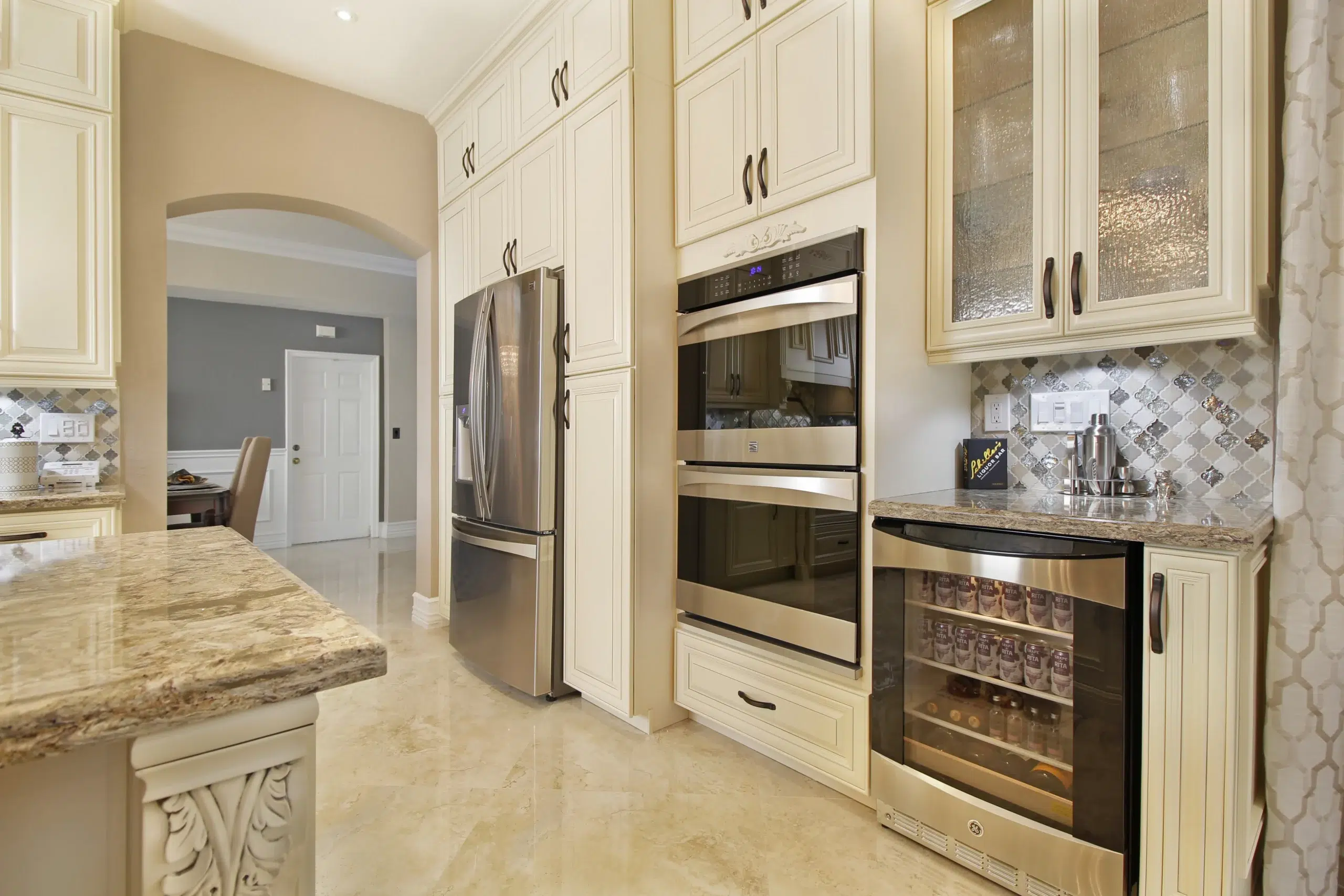 Step into a world of timeless elegance with this grand, traditional kitchen. Richly detailed, glazed cream cabinetry is adorned with ornate moldings, carved corbels, and oil-rubbed bronze hardware. Warm, intricate granite countertops flow across the space, complemented by a decorative arabesque tile backsplash. From the custom-paneled range hood to the crystal chandeliers, every element is crafted to create an atmosphere of classic luxury and inviting warmth.