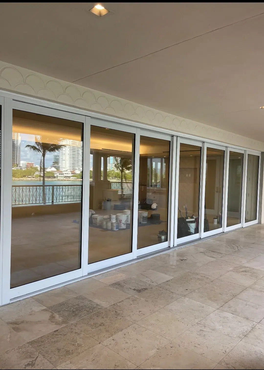 Enhance your home’s safety and style with these multi-panel impact sliding glass doors, perfect for South Florida’s coastal living. This installation provides robust hurricane protection without sacrificing the stunning waterfront views. The clean, white frames and bronze-tinted glass offer superior security, energy efficiency, and UV protection, creating a secure and comfortable living space ready to withstand the storm.